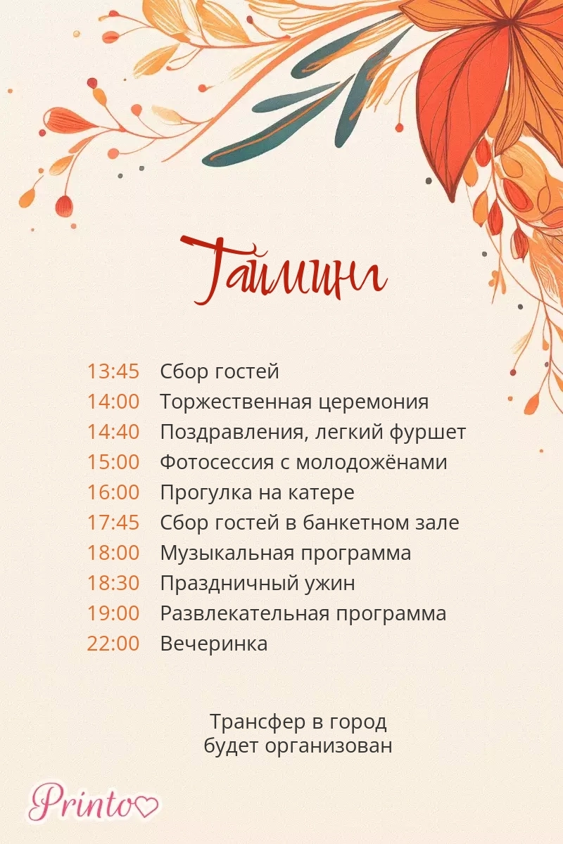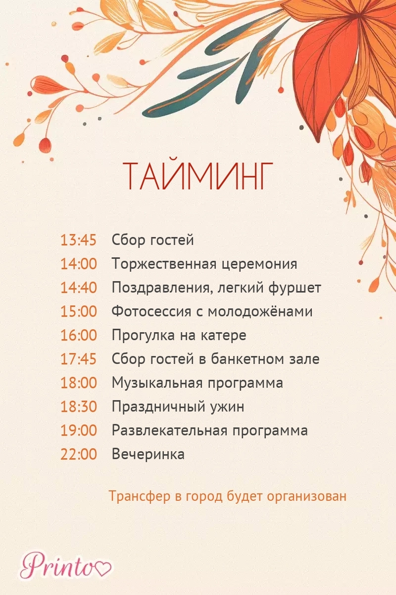 Расскажите гостям о программе свадьбы. Укажите время начала и окончания, а так же основные мероприятия.