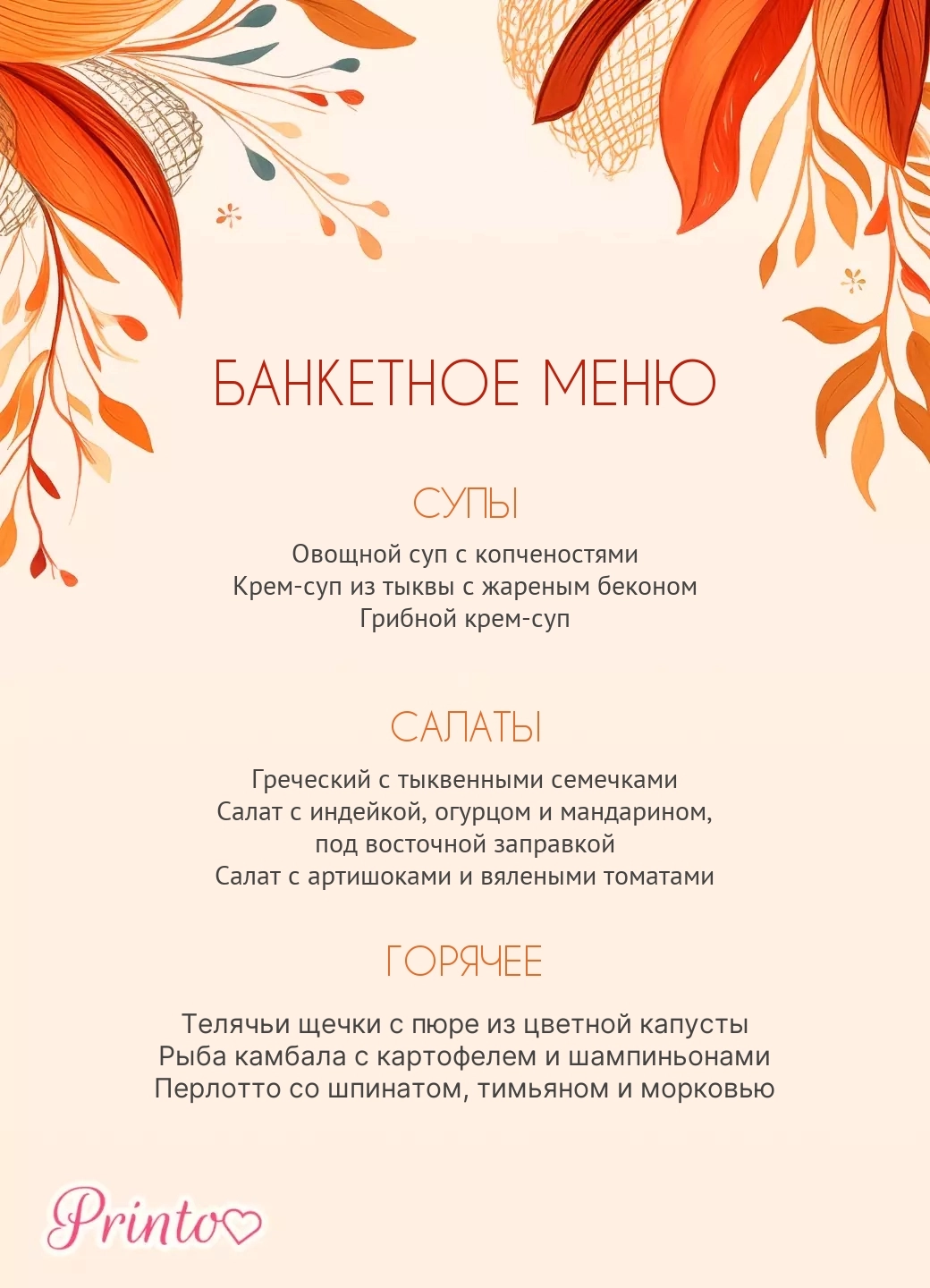 На листе меню обычно указывают блюда, которые будут поданы на свадьбе, а так же напитки и десерты.